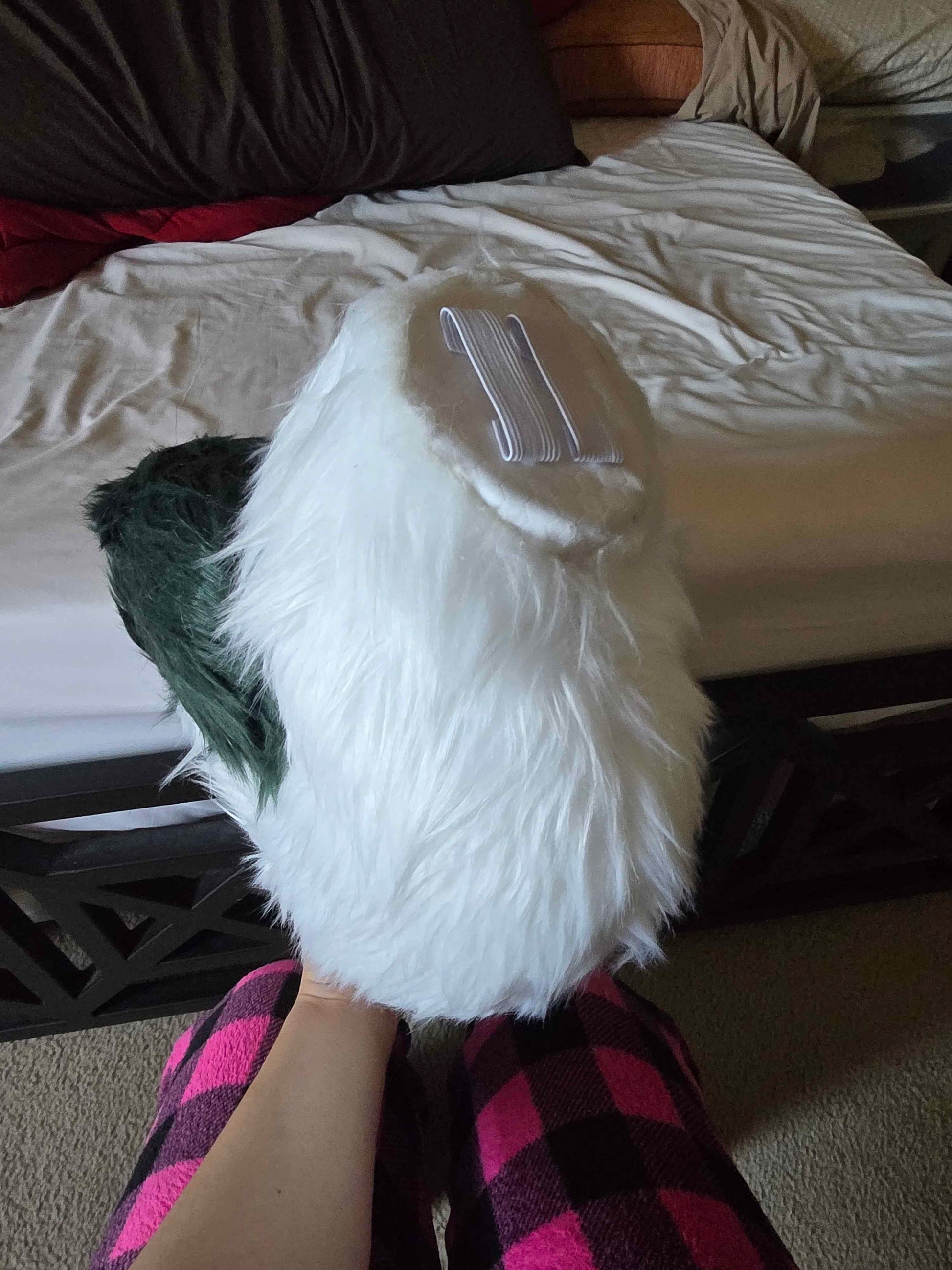 A 1.5 ft wide thick, curled husky tail with a dark green tip and white base! It also has belt loops for security!